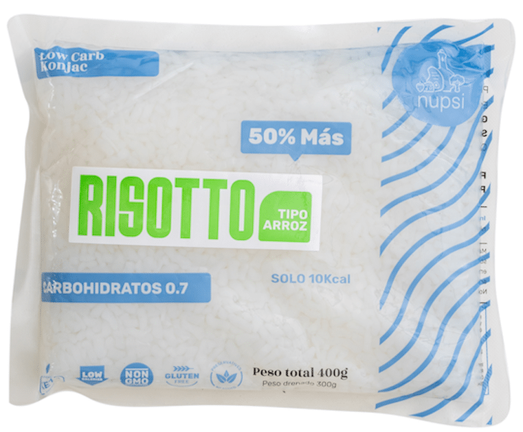 Nuestro Risotto viene en corte tipo arroz, y es la opción perfecta para preparar deliciosos platos como chaufa, paella, arroz con verduras, etc; es bajo en calorías y muy bajo en carbohidratos. Hecho de 100% puro Konjac.